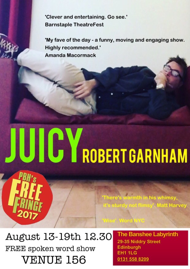 This year, I feel completely different. I have a brand new show, Juicy, which is a completely different beast. Rather than set out with a story and an idea, I just opened up my mind and threw everything at it. The result is a show which has the potential to be different every day, with different poems and different linking material. It’s adaptable, loud and doesn’t rely so much on props and long quiet set pieces. It’s also, I hope, very funny.